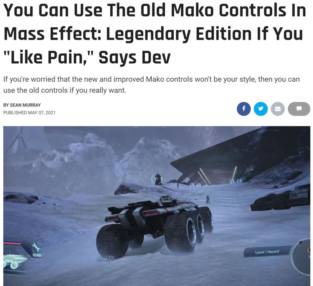 The Mako was more than just a space truck that handled about as well as a group of eels ice skating. While covered in mayonnaise. But to the delight of ALL the gamers who joined “Mako Anger Management” groups over the years, the controls of the Mako are ALSO getting a complete remaster. This is not just some new coat of paint either… the Mako has been redesigned from the ground up to insure newcomers to the series NEVER have to know the pain of driving the original. Unless, you know… they REALLY want to. Because in a bizarre twist of events, the developer who OPENLY acknowledged the original controls were painful to play with made a “fun” decision… the ORIGINAL broken Mako controls are still an option for those who want to experience the horrors of controlling this monstrosity in its original incarnation. As you can see by the small collection of articles I have scraped together (there are many more), there really can only be ONE question to ask those who knowingly choose this pain… ‘WHY???!!!!!”