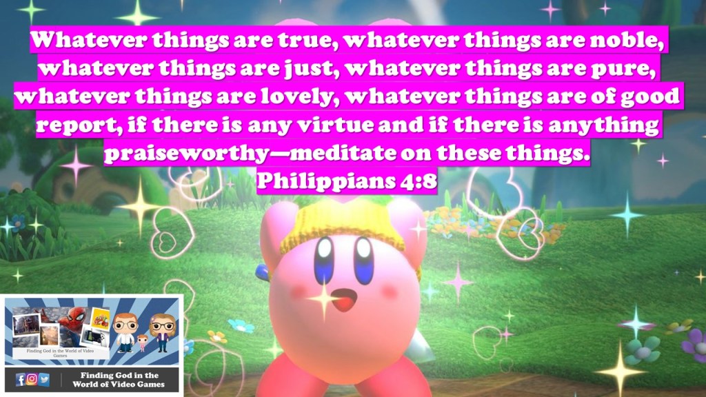 That’s it… that’s the list. That is the criteria for what is safe for consumption and actually benefits our walk with Christ and advances HIS Kingdom. And when we are considering the various means of ingesting information into our minds, this is the list of what makes the cut. And to be truly beneficial, it must meet ALL of the criteria, not just ONE element. There are things that are true, but are they praiseworthy? There are things that are lovely, but are they pure? When we make the decision on what to read, watch, listen to, talk about, post about, or interact with we must prayerfully review what is beneficial to meditate on and determine if if makes our “Kirby” stronger or weaker. And depending on where we are at in our journey, there may be specific abilities and skills that are simply more profitable than others… not because there is anything wrong with a Kirby that has the ability to turn into an impenetrable rock, but because there are times that the current challenge would be much easier if Kirby was carrying a powerful sword instead. Let the Spirit of God guide you on what input is MOST beneficial for you to absorb, and resist the urge to simply copy the other “Kirby’s” around you… the Lord knows the unique season you are in and what specific battles you are about to face.