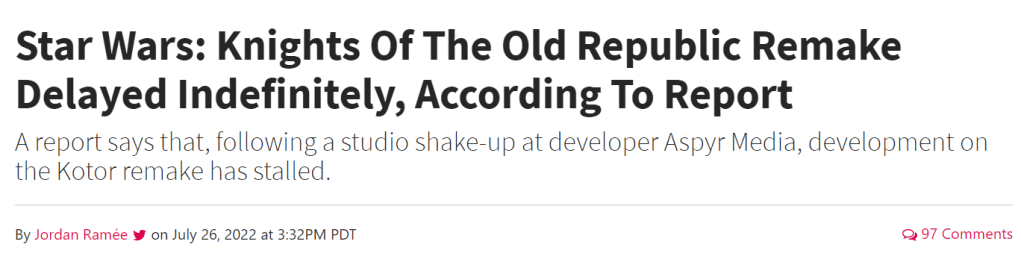I can only think of one response to the news that the highly anticipated remake of Star Wars: Knight of the Old Republic has been delayed indefinitely… in the immortal words of Luke Skywalker himself, “NOOOOOOOOooooooooo!!!” To be fair, when I heard that the remake of one of the most beloved games of all time was in the hands of a relatively unproven studio (Aspyr), I was a little concerned. When it was announced that the remake would be exclusive to the Sony PlayStation 5 platform, I relaxed a little in the hope that focusing on one platform would optimize their developmental approach. When the recent remasters hit with a few critical bugs (like not being able to actually finish the game), my concern grew to alarm. So, when the news broke that a vertical slice of the game performed so poorly that the lead design director and art director were terminated from the project and the game has been postponed indefinitely, I can’t say I was surprised. I was absolutely disappointed, but the truth is the writing was on the wall from day one for this game. This game won’t be coming out anytime soon, and it is kind of hard to spin that news into a positive. But with the Star Wars franchise experiencing a level of mainstream popularity that is arguably as big as it has been since the launch of the original trilogy, broken games that reflect poorly on the brand are simply not an option the way they may have been previously. Both LucasArts and Sony looked at the progress of the game and decided it was not where it needed to be… especially for a game that was reportedly projected to release at the end of this year. The interminably long wait for my beloved KOTOR remake begins… again.