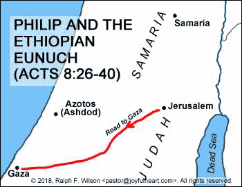 Acts 8:26-39 Now an angel of the Lord spoke to Philip, saying, “Arise and go toward the south along the road which goes down from Jerusalem to Gaza.” This is desert. So he arose and went. And behold, a man of Ethiopia, a eunuch of great authority under Candace the queen of the Ethiopians, who had charge of all her treasury, and had come to Jerusalem to worship, was returning. And sitting in his chariot, he was reading Isaiah the prophet. Then the Spirit said to Philip, “Go near and overtake this chariot.” So Philip ran to him, and heard him reading the prophet Isaiah, and said, “Do you understand what you are reading?” And he said, “How can I, unless someone guides me?” And he asked Philip to come up and sit with him. The place in the Scripture which he read was this: “He was led as a sheep to the slaughter; And as a lamb before its shearer is silent, So He opened not His mouth. In His humiliation His justice was taken away, And who will declare His generation? For His life is taken from the earth.” So the eunuch answered Philip and said, “I ask you, of whom does the prophet say this, of himself or of some other man?” Then Philip opened his mouth, and beginning at this Scripture, preached Jesus to him. Now as they went down the road, they came to some water. And the eunuch said, “See, here is water. What hinders me from being baptized?” Then Philip said, “If you believe with all your heart, you may. And he answered and said, “I believe that Jesus Christ is the Son of God.” So he commanded the chariot to stand still. And both Philip and the eunuch went down into the water, and he baptized him. Now when they came up out of the water, the Spirit of the Lord caught Philip away, so that the eunuch saw him no more; and he went on his way rejoicing.