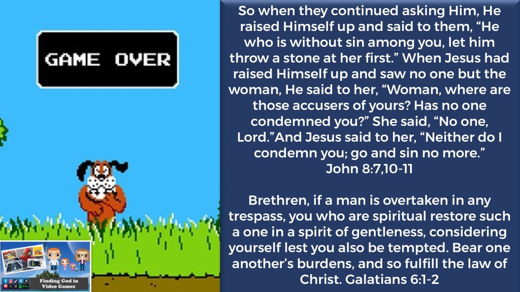 Every one of us miss the mark in life, and as followers of Christ and fellow recipients of His grace we are called to forgive, repair broken fellowship, and restore our repentant brothers and sisters in Christ. In a world full of “Duck Hunt Dogs” who rush to mock other’s failures and judge those who’ve fallen, we are called to show the same grace that the Lord has shown to each of us… not add insult to injury. All who have fallen to sin have suffered enough… His church should be known as the place where all who seek forgiveness and grace will find it.