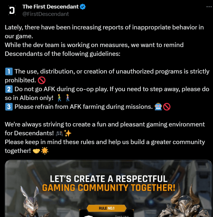 “The First Descendant” from Nexon Games has achieved a modest amount of notoriety in the few short weeks since its’ launch for multiple reasons… such as liberally borrowing most of its’ ideas and gameplay choices from better games as well as demonstrating some of the worst trends in excessive monetization (which even the best games have done) to using identical icons in their title that were previously used in another well-known loot shooter series, Destiny (okay, nobody usually does that). But now it is the ACTUAL PLAYERS OF THE GAME who are getting in on the controversies as well… by exploiting a part of the game that allows them to reap all of the benefits of completing missions without actually participating in them. It is called “AFK farming”… the practice of joining in other player’s missions and then going “away from keyboard”, setting up your controller to simply run in circles or perform a similarly repetitive behavior that bypasses the game’s detection system that would typically boot a non-contributing player out of the party. The result? The players who are actually participating in the mission do all of the work, and the “AFK farmer” gets the incredibly valuable EXP points that accompany the victory without lifting a finger to help. And in a game that is a cooperative experience at its’ core, this predicament creates the possibility of the worst possible outcome… a game full of players where nobody is actually PLAYING.