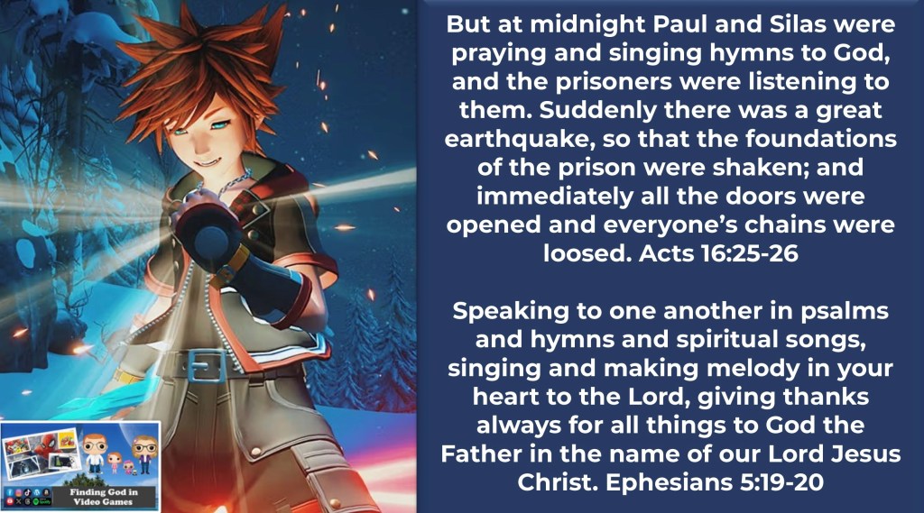 The musical soundtrack behind each level of Kingdom Hearts does more than provide a bit of ambience… it changes the way we perceive the area that we are in and causes us to either relax and casually explore the environment OR grip our controller tightly in dread of what is coming next. From the cheerful tones that play while we romp around Destiny Island to the haunting dirge that lets us know we’ve arrived at Hollow Bastion, the music informs how we are supposed to feel about each area we are in… but we can always choose to listen to a more energetic and uplifting song like the “Sanctuary” theme to remind us that we were sent to overcome these dark places, not allow them and their “mood music” to define us.