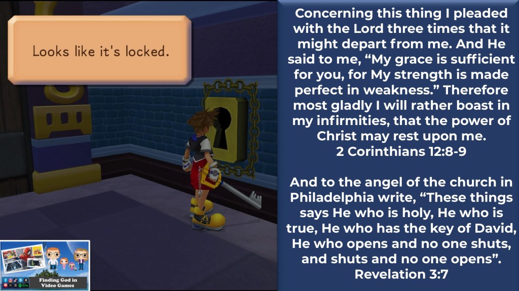While each world in Kingdom Hearts is open for general exploration, there are many areas within each level that are not designed for us to interact with. While trying to open a door that isn’t designed to be entered or seeing an area in the distance that we can’t reach can be frustrating and disappointing, the truth is there isn’t actually anything in there for us. These may appear to be potential destinations that contain hidden treasures, but the designer of the game knew exactly what we would need for our adventure and where we are meant to go… and doors that don’t contain anything worth finding are designed to remain closed.