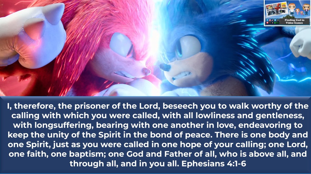 Our initial introduction to Knuckles the echidna in both his gaming appearances as well as his cinematic adventures is typically adversarial in nature… the circumstances that bring Knuckles and Sonic together in the story also brings them into a place of conflict with each other. But while they both had different ideas on how to protect the Chaos emerald, they also realized that they had been manipulated into seeing each other as opposition… and wasting their time and energy fighting with each other only served to pull them away from their shared purpose. Sure, they still disagree on tactics from time to time, but their common goal unifies them as a team against the real enemy seeking to divide and conquer them.