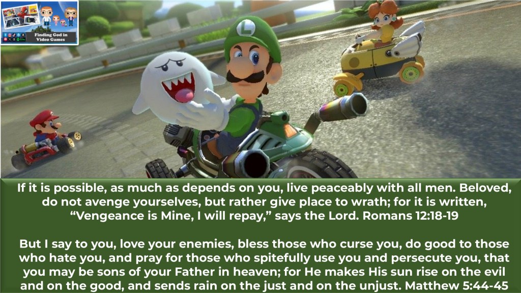 There will be many times that we are treated poorly by our fellow racers in life, but taking these matters into our own hands is always a recipe for self-inflicted disaster. The Lord is both our Judge and Avenger for a good reason, as He is the only one with an omniscient view of the entire track and how the entirety of the race will unfold. Let’s focus on running the “good race” today, knowing that our itchy trigger fingers firing off the green shells of attacks and insults rarely results in accomplishing His will on this planet. We are called to be peacemakers, not vengeance seekers… let’s turn the other cheek, and trust in the Lord to fight our battles.