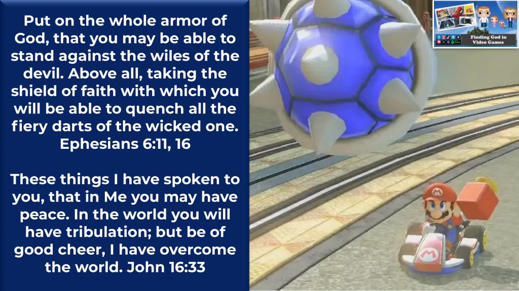Abundant life in Christ is not the absence of persecution, but the presence of His Spirit with us through every trial and tribulation we face. Fellow racers like Joseph and Paul found His grace while unfairly confined in prison, while Ruth and Job experiences His hand of provision after a blue shell attack completely devastated their lives. We are told to take up the armor of God daily because we WILL be attacked… our unjustly murdered Savior promised we’ll face similarly brutal opposition in this life. Let’s expect both the enemy AND the Almighty to show up in our races today… we carry a shield for a reason.