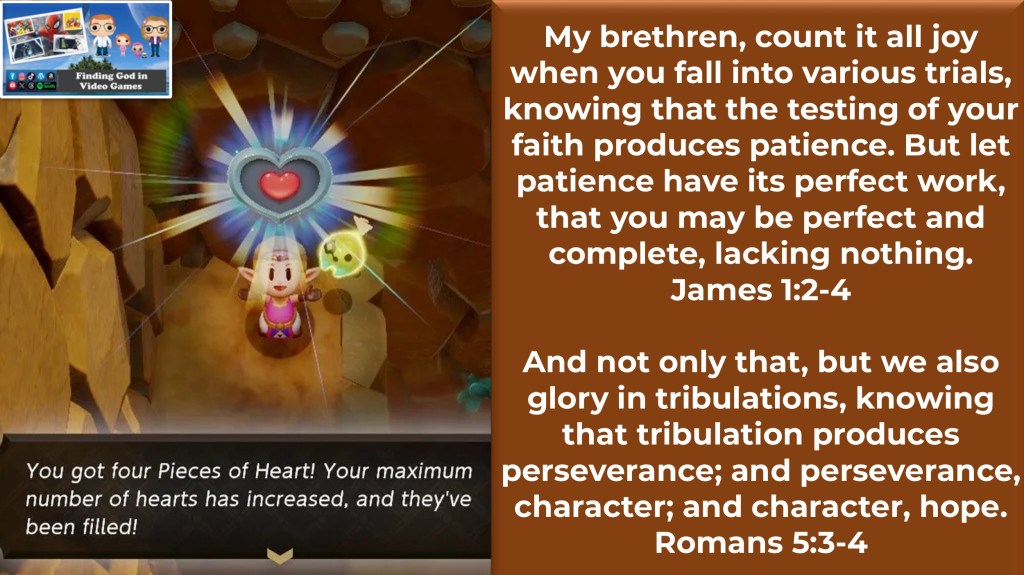 The challenges that we endure in life may feel arbitrary or pointless at the time we are going through them, but the hidden value they contain isn’t typically revealed until we’ve fully pressed through them to the other side. In His infinite grace, the Lord uses these dungeon experiences and even our enemy’s attacks to build up our faith to the level that our upcoming battles will require. Each painful trial we face might not appear to have a visible reward right now, but let’s trust in His process… the “heart pieces” we are acquiring by trusting Christ in this testing period holds the key to our future victories.