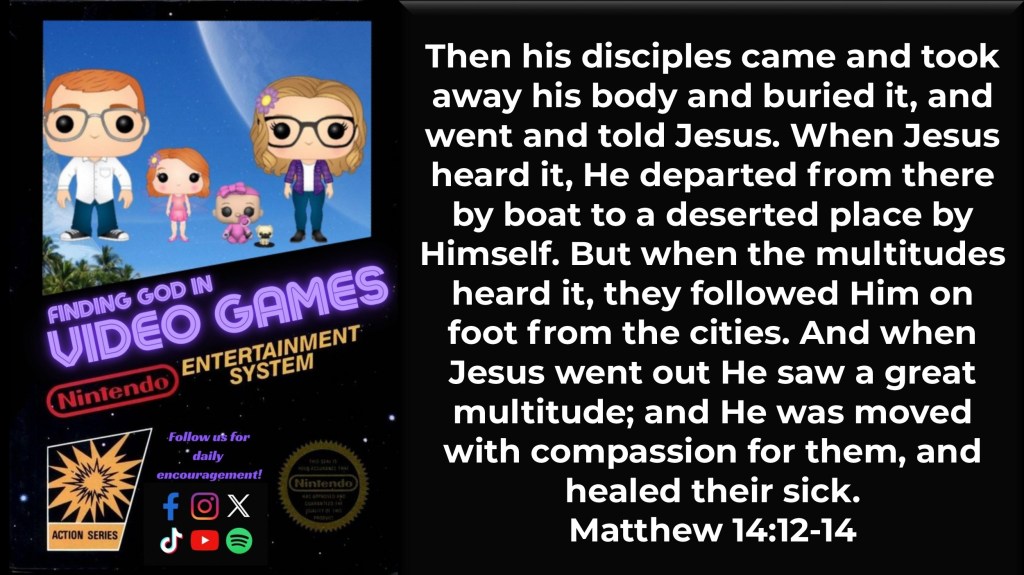 Then his disciples came and took away his body and buried it, and went and told Jesus. When Jesus heard it, He departed from there by boat to a deserted place by Himself. But when the multitudes heard it, they followed Him on foot from the cities. And when Jesus went out He saw a great multitude; and He was moved with compassion for them, and healed their sick. Matthew 14:12-14