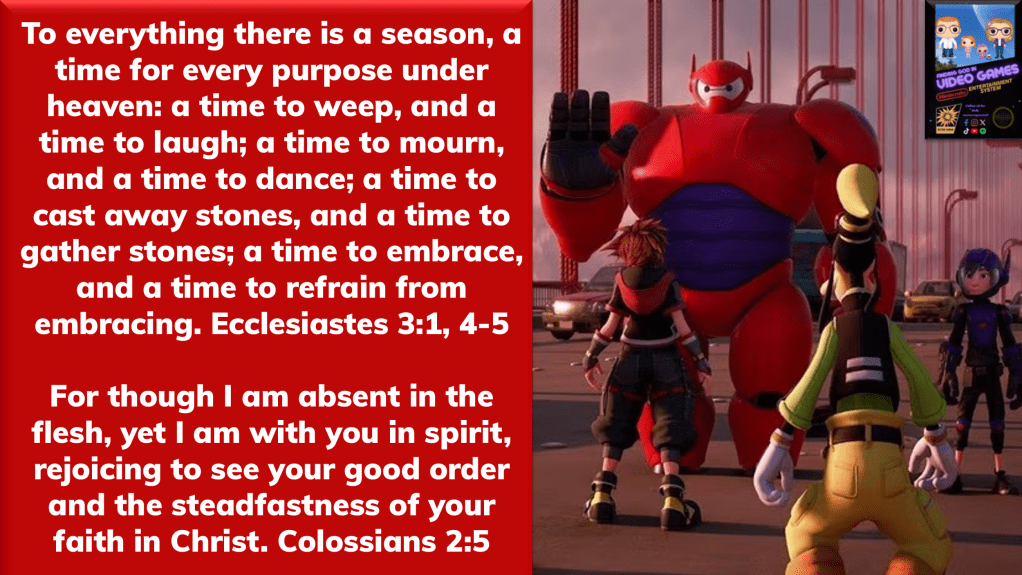 At multiple points in Kingdom Hearts we are given access to “guest characters” who join our party and help us out for a little while, but they don’t get to travel with us beyond the world they were designed for. Ariel, Beast, Tarzan and many more became critical allies during one part of our story, but as we moved on to the next level their path diverged from ours because their story required them stay behind in their own. While it would be nice to bring Beast’s power or Ariel’s healing abilities with us into our next chapter, we have new friends to meet with different missions to complete. They didn’t stop caring about us…their destiny just lies on a different path than ours.